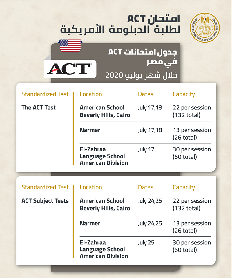 زاد الطالب التعليم تعتمد اختبارات Act داخل مصر لطلاب الدبلومة الأمريكية كتقييم مؤدي الي تنسيق الجامعات